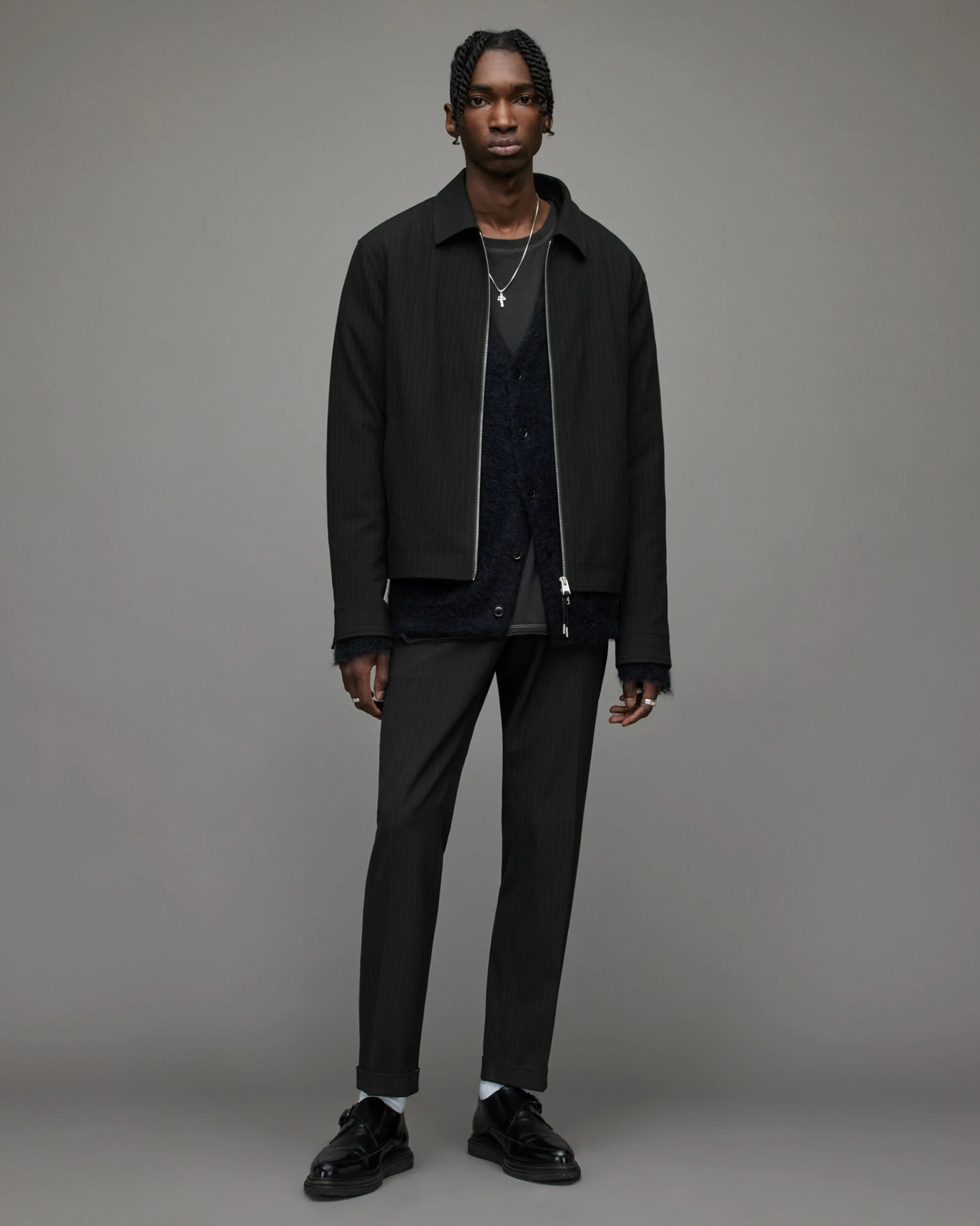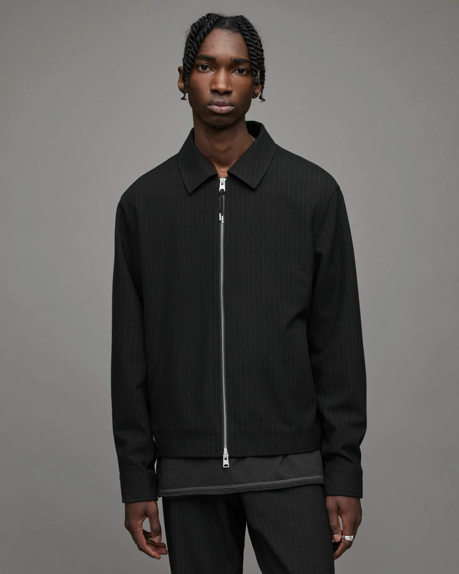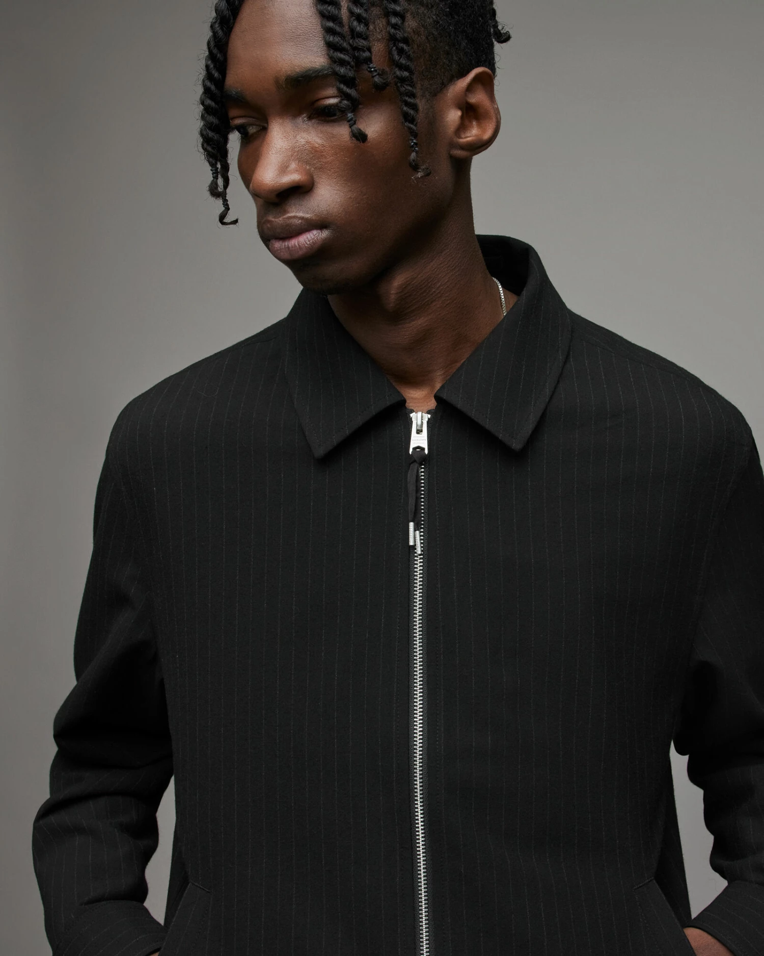 Pinstripes. Let’s keep them subtle. The Barrow Jacket redefines tailoring. The easy shape features back pleated detailing. Completed with side pockets and zip closure. We have trousers that match.