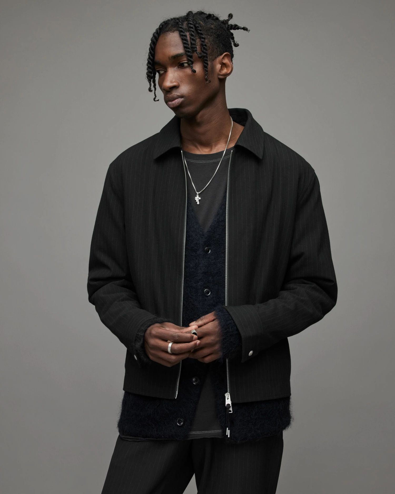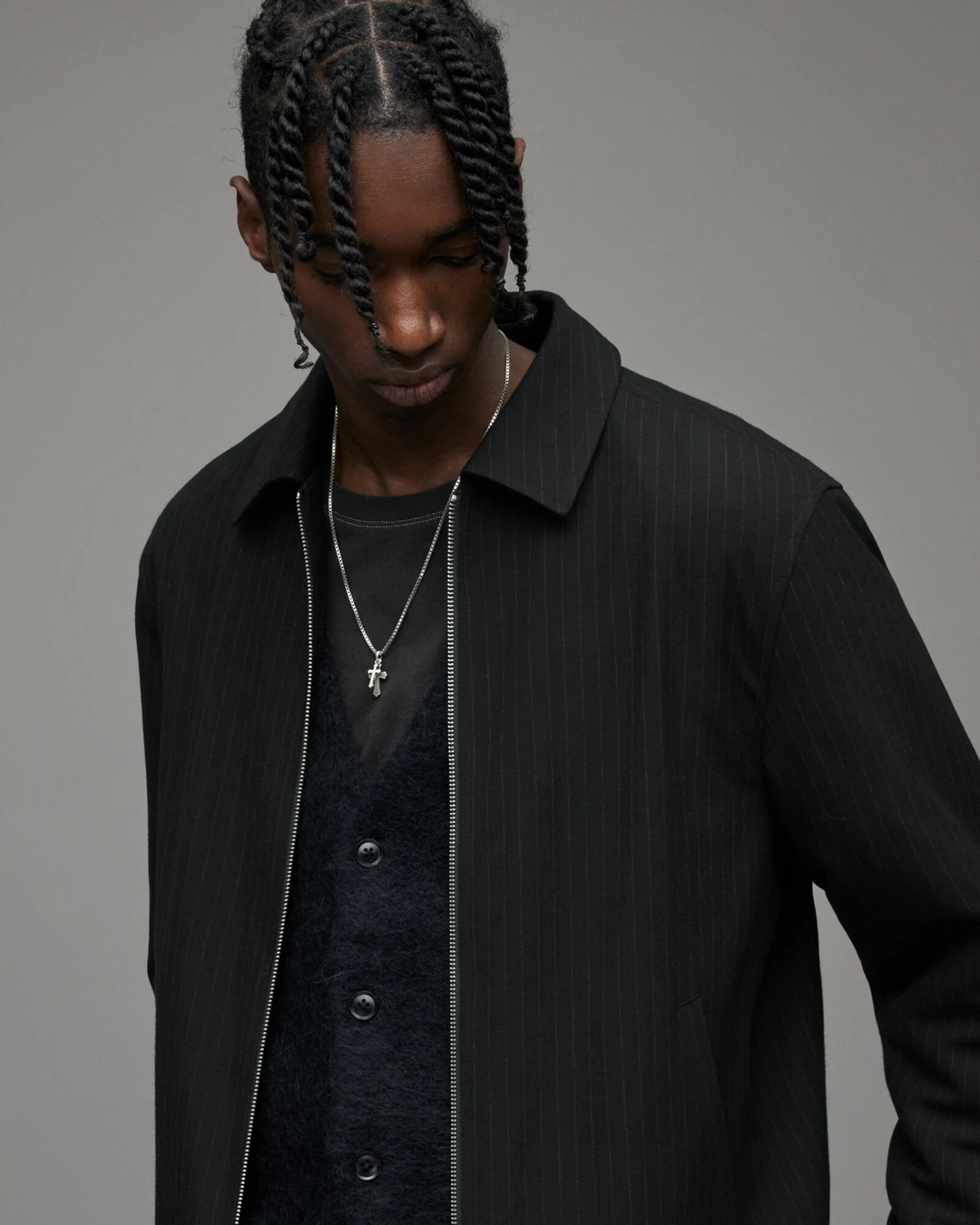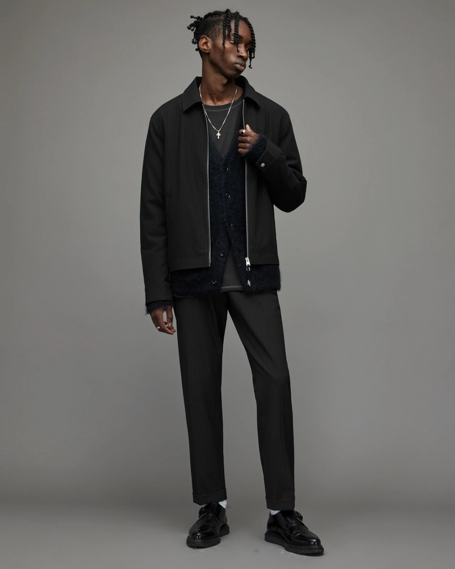 Pinstripes. Let’s keep them subtle. The Barrow Jacket redefines tailoring. The easy shape features back pleated detailing. Completed with side pockets and zip closure. We have trousers that match.