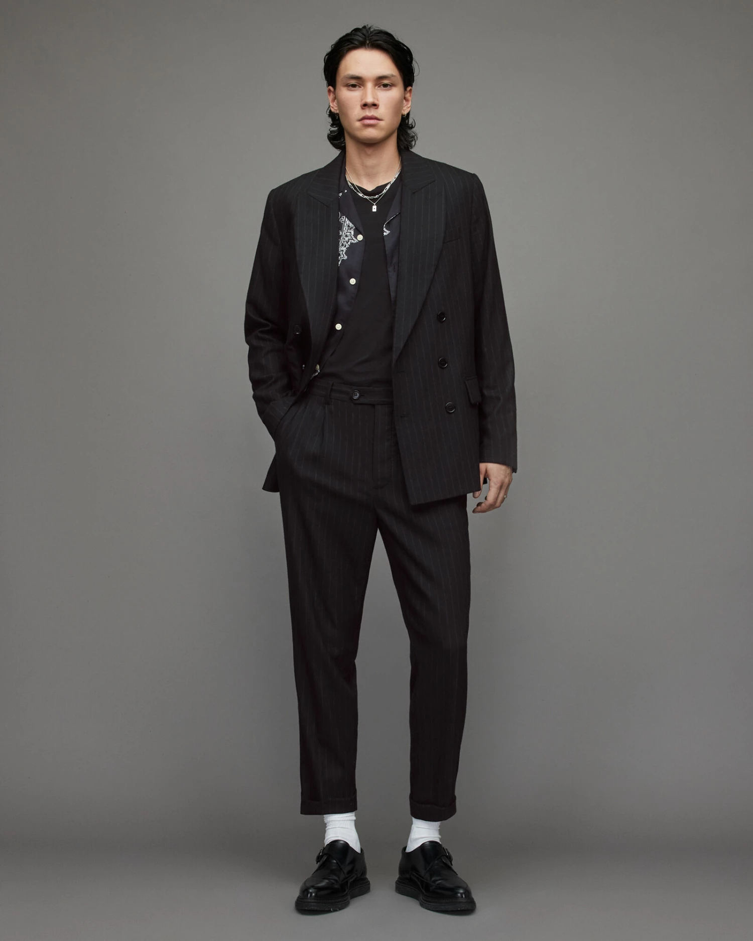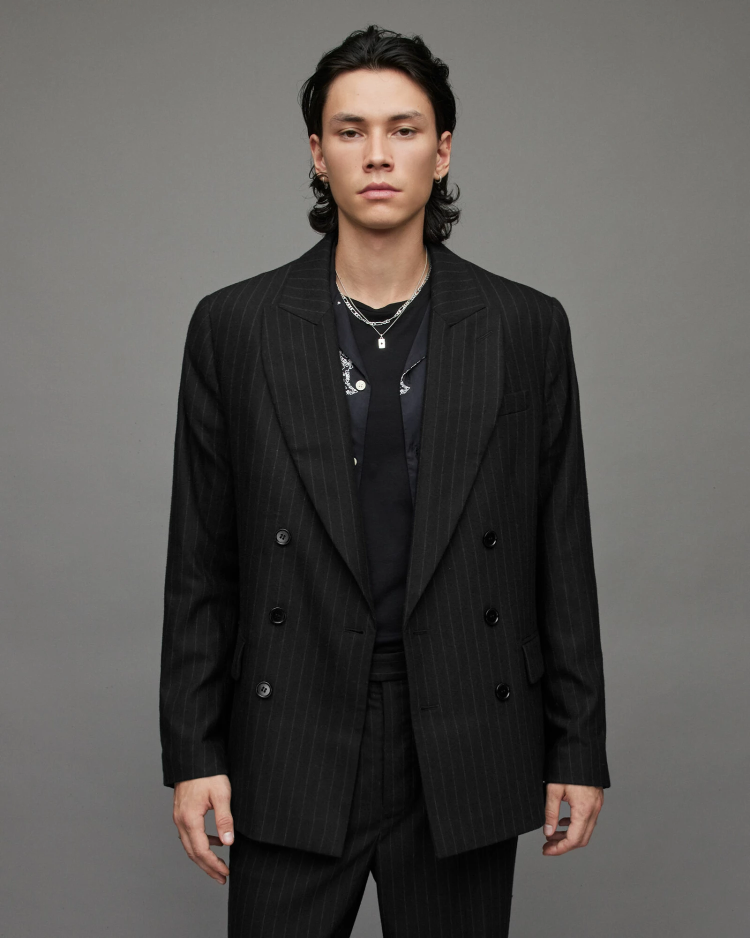 We’re into the Blues Blazer. Pinstriped, but it’s not obvious. This tailored staple has a modern feel. Shaped to a relaxed fit with a peak lapel.