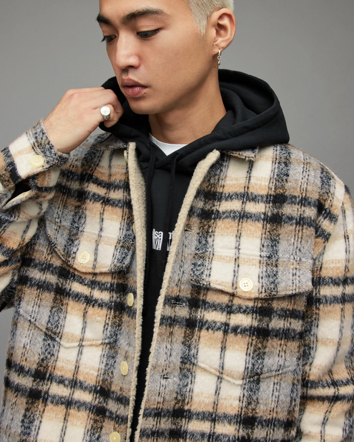 Overshirts are a styling essential. The Cayuga is relaxed with classic check and military pockets. The faux shearling lining makes it super cosy.