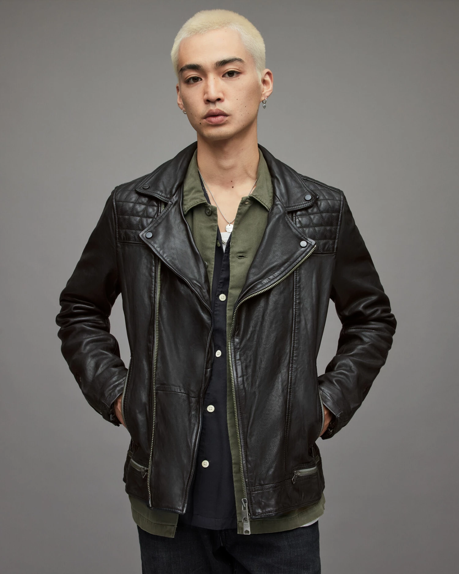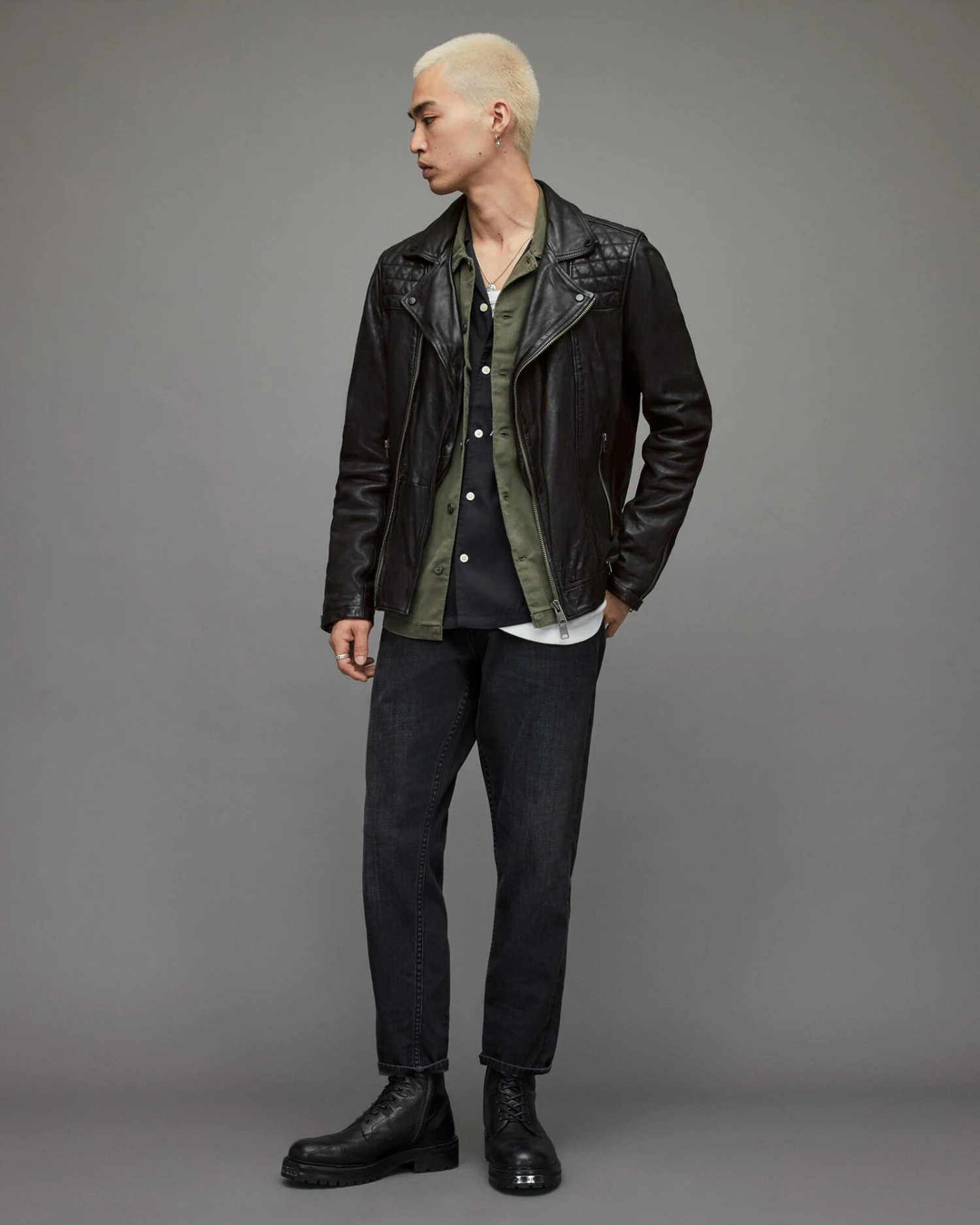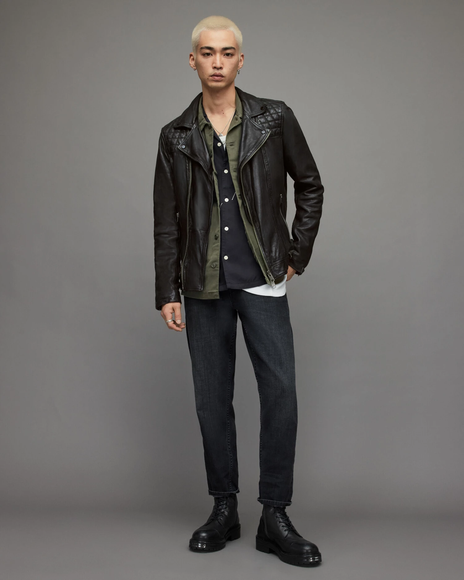 The Conroy Biker Jacket is a classic leather piece. Featuring traditional detailing including an asymmetric zip fastening, zipped cuffs and quilted shoulder panels. Finished with a lightly crinkled effect for a worn-in aesthetic.