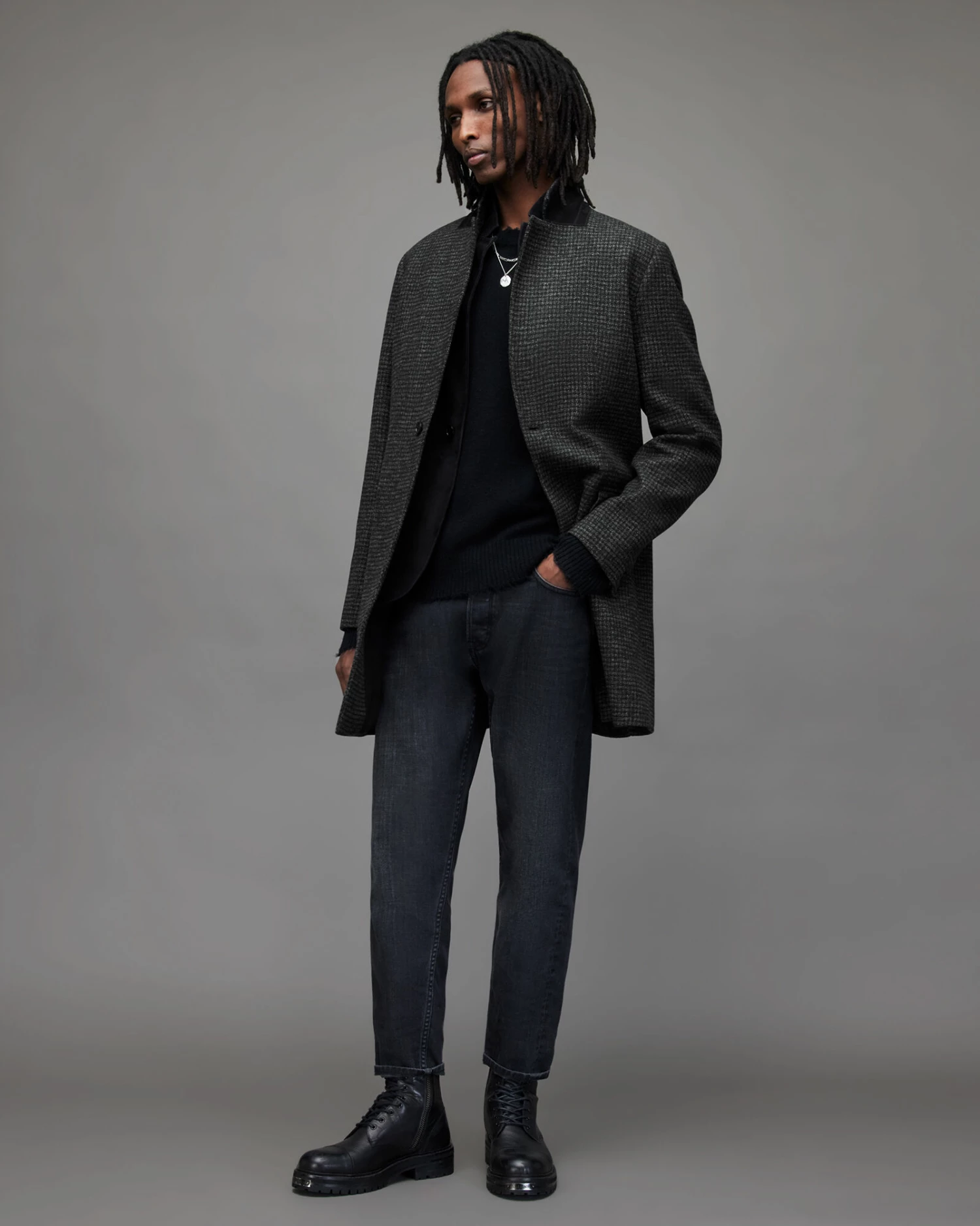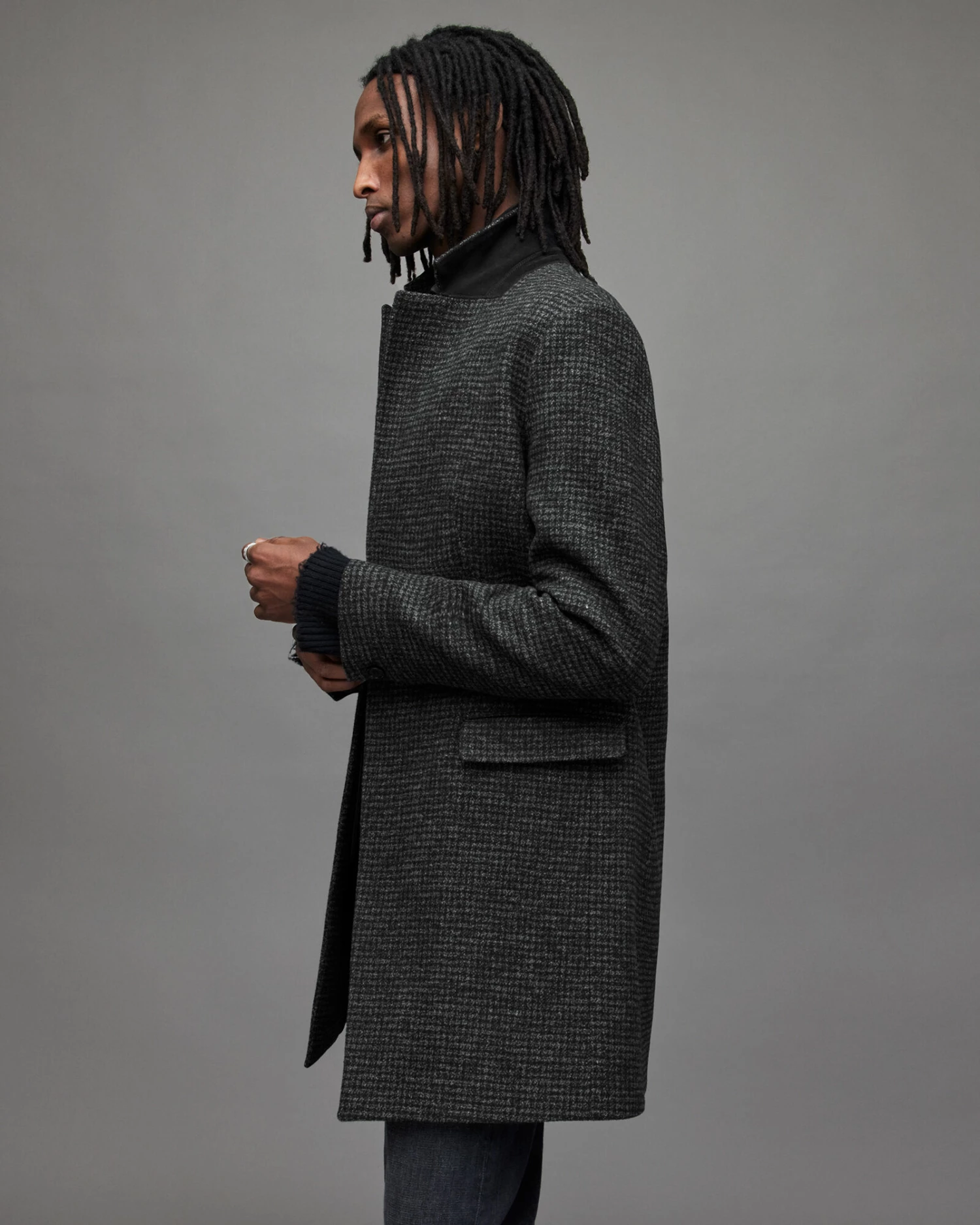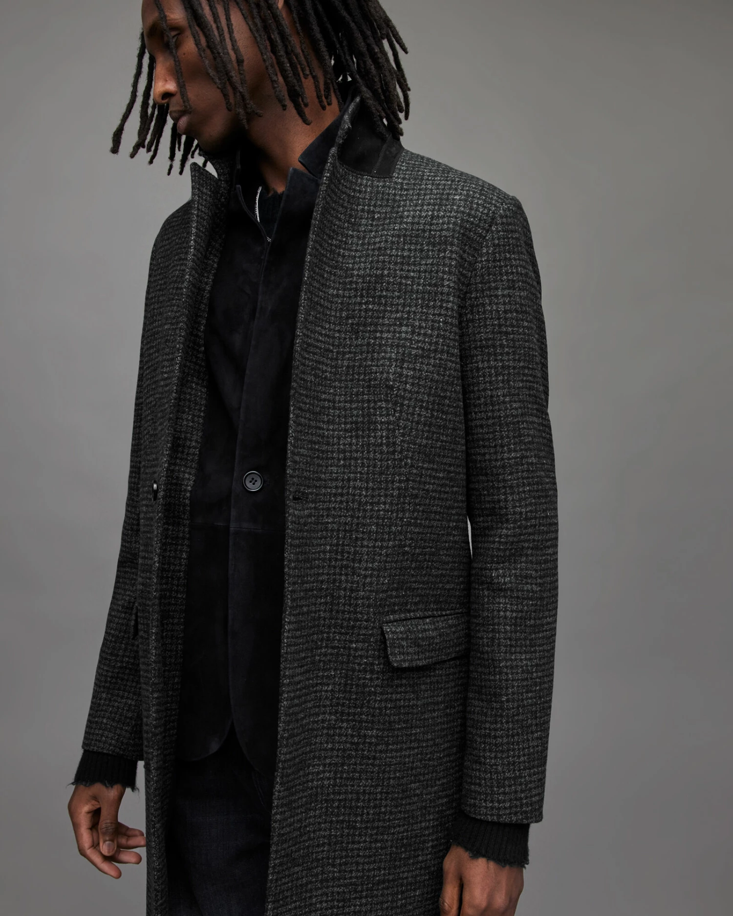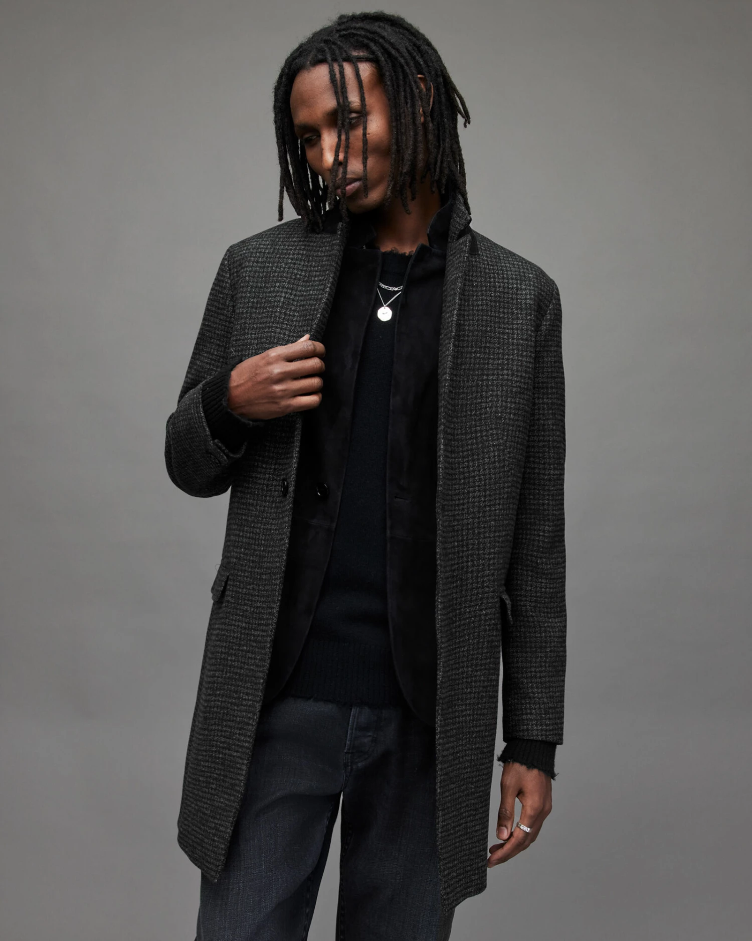 Step out in the Ginsberg Coat. The double layered construction features a wool-blend outer with a fine houndstooth texture. While the nubuck trim keeps the warmth in. Shaped to a cut-away front silhouette, it’s tailored to a sleek fit.