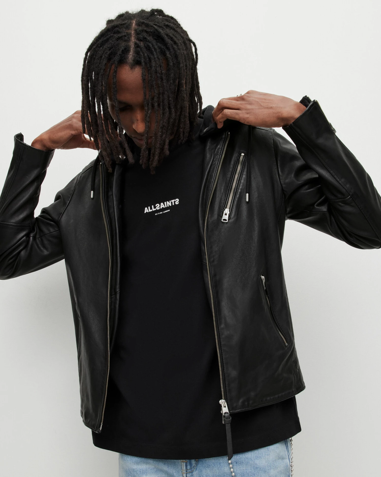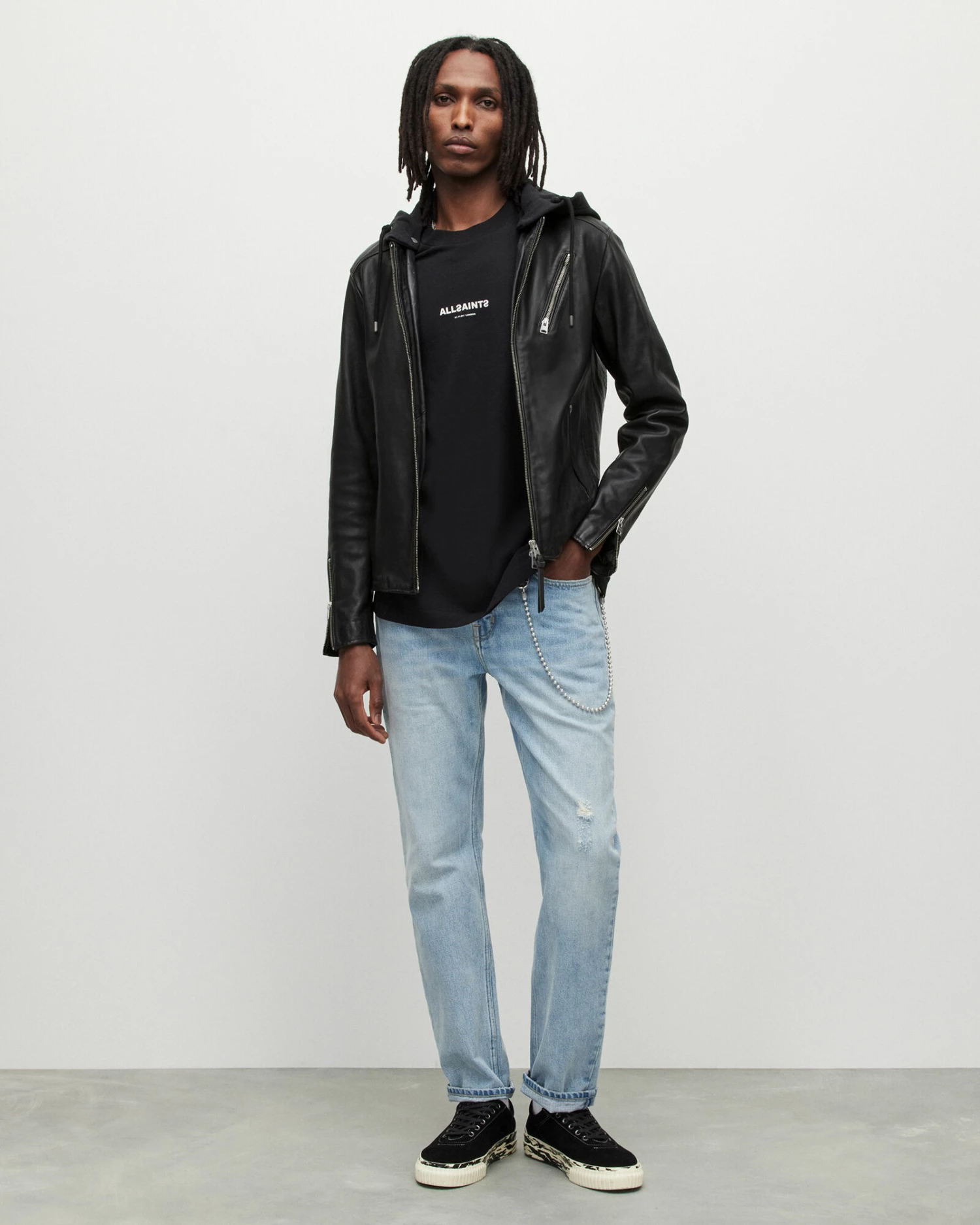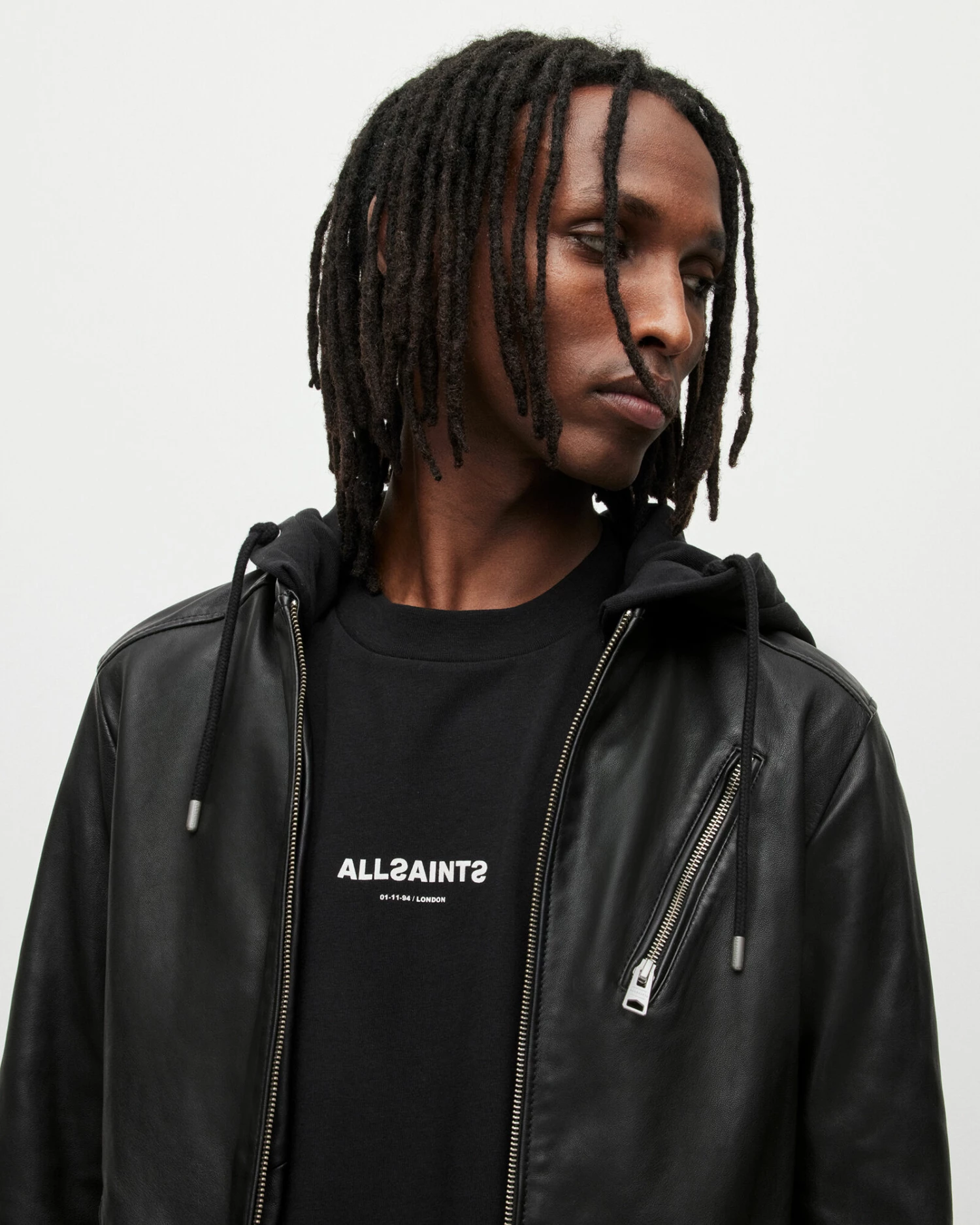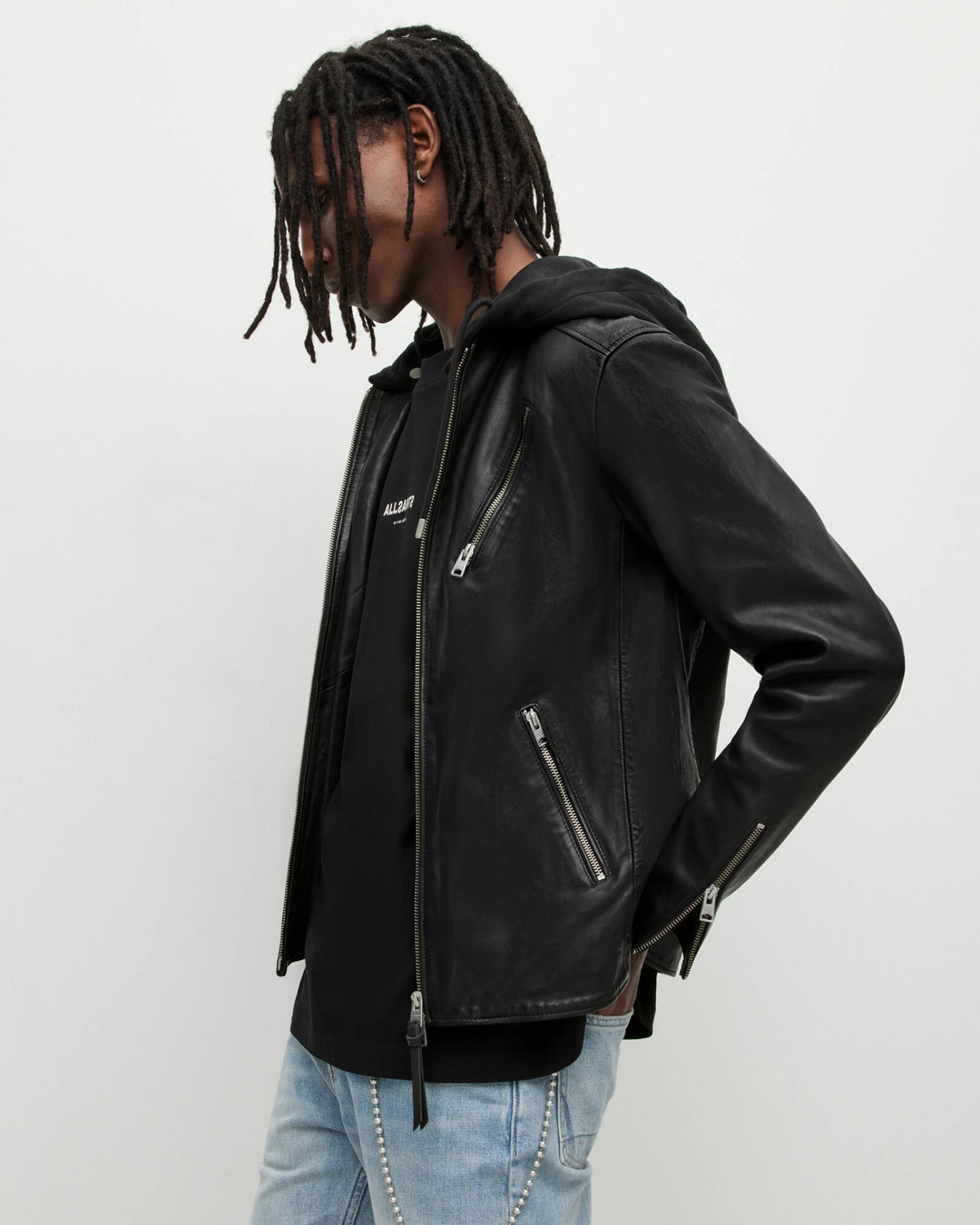 Refined leather with a street-wear edge. The Harwood Jacket is crafted from smooth leather with biker-inspired metal hardware. A removable sweatshirt hood contrasts the premium body.