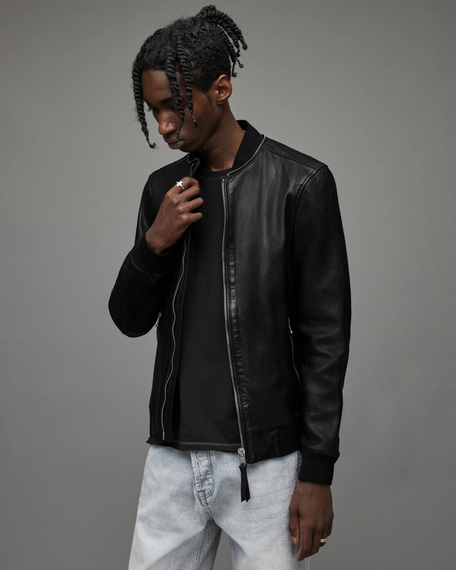- Leather welt pocket with ball and chain zip pockets on top
