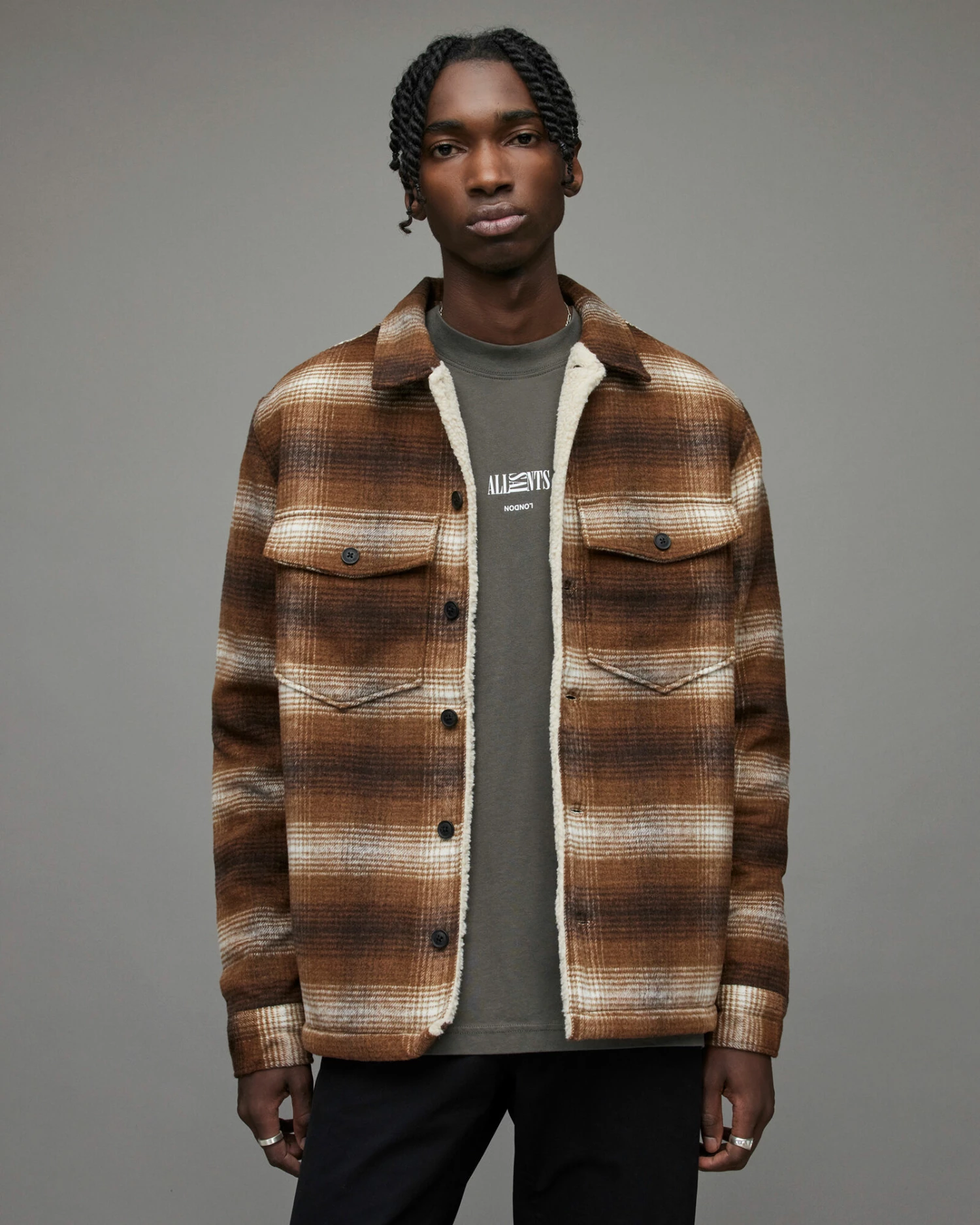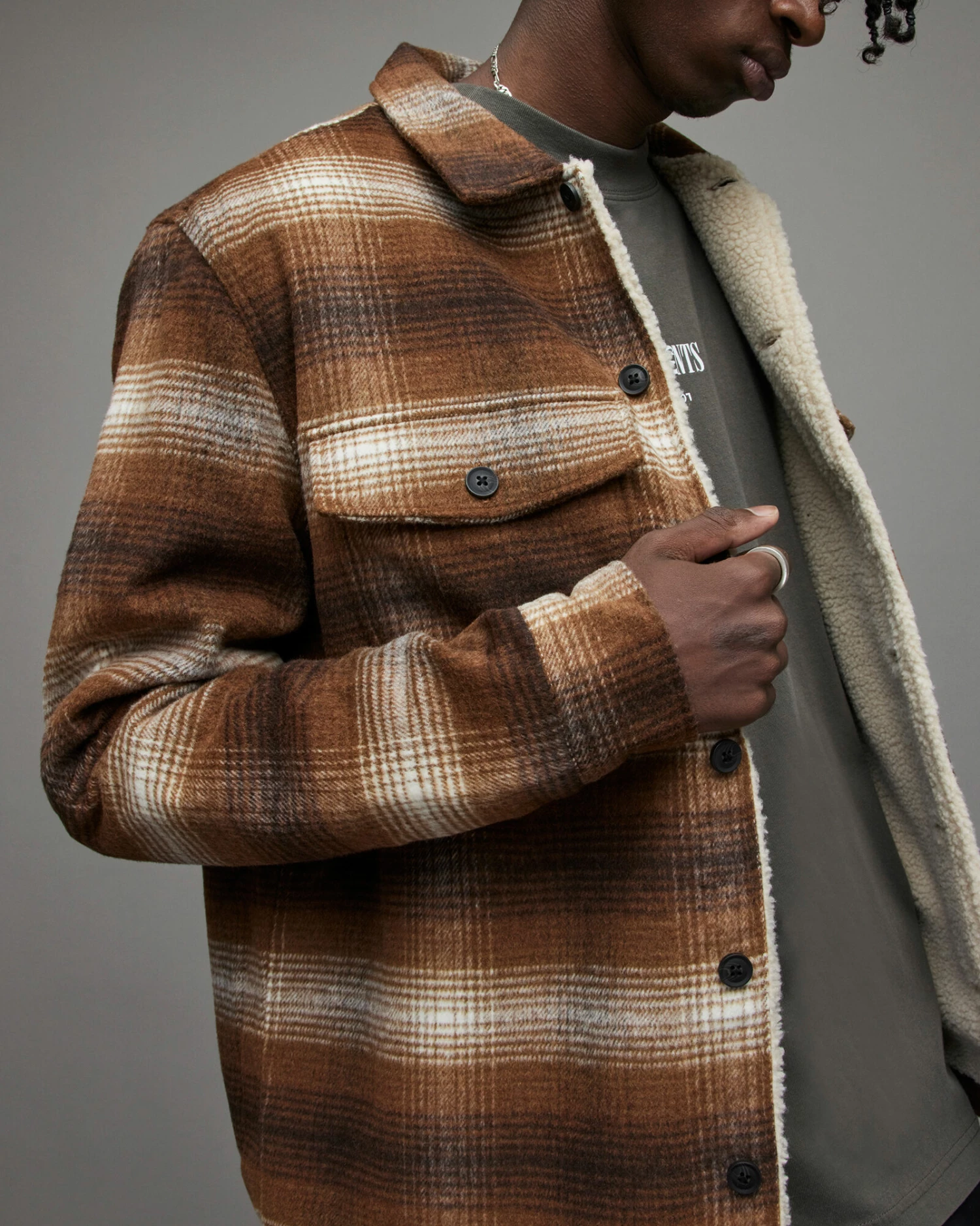 Keep warm with casual layers. The Seneca Jacket is checked with a faux shearling interior. Textured with two pockets on the chest.