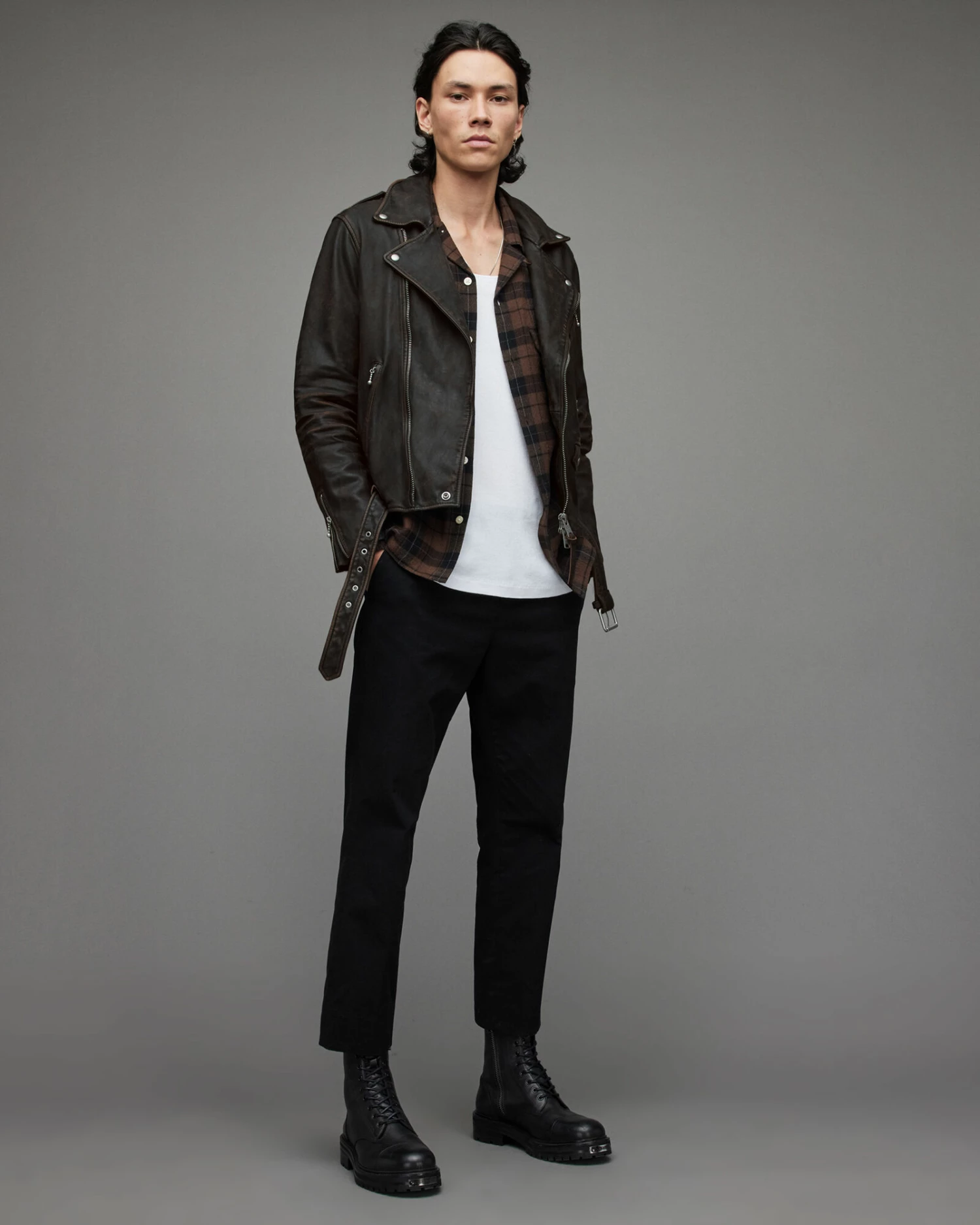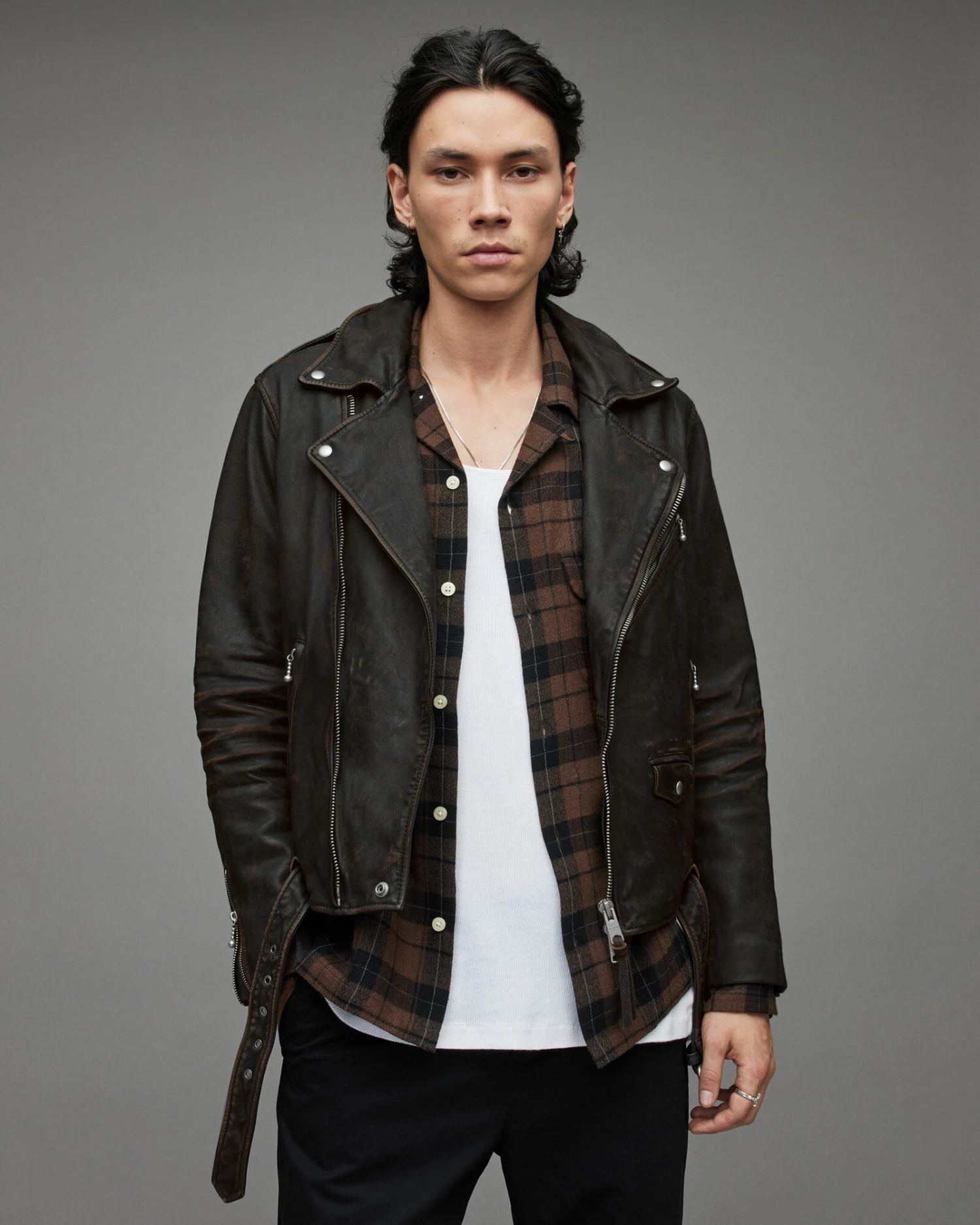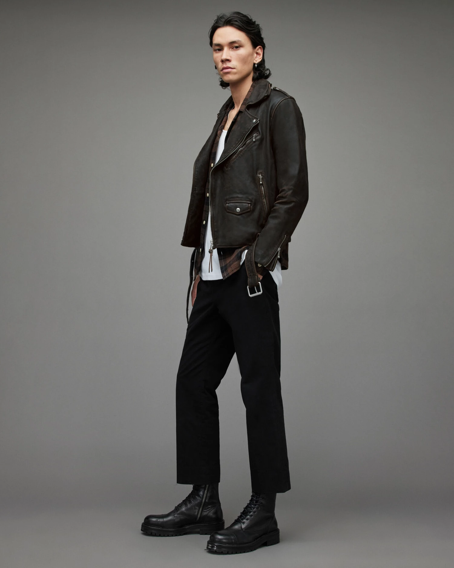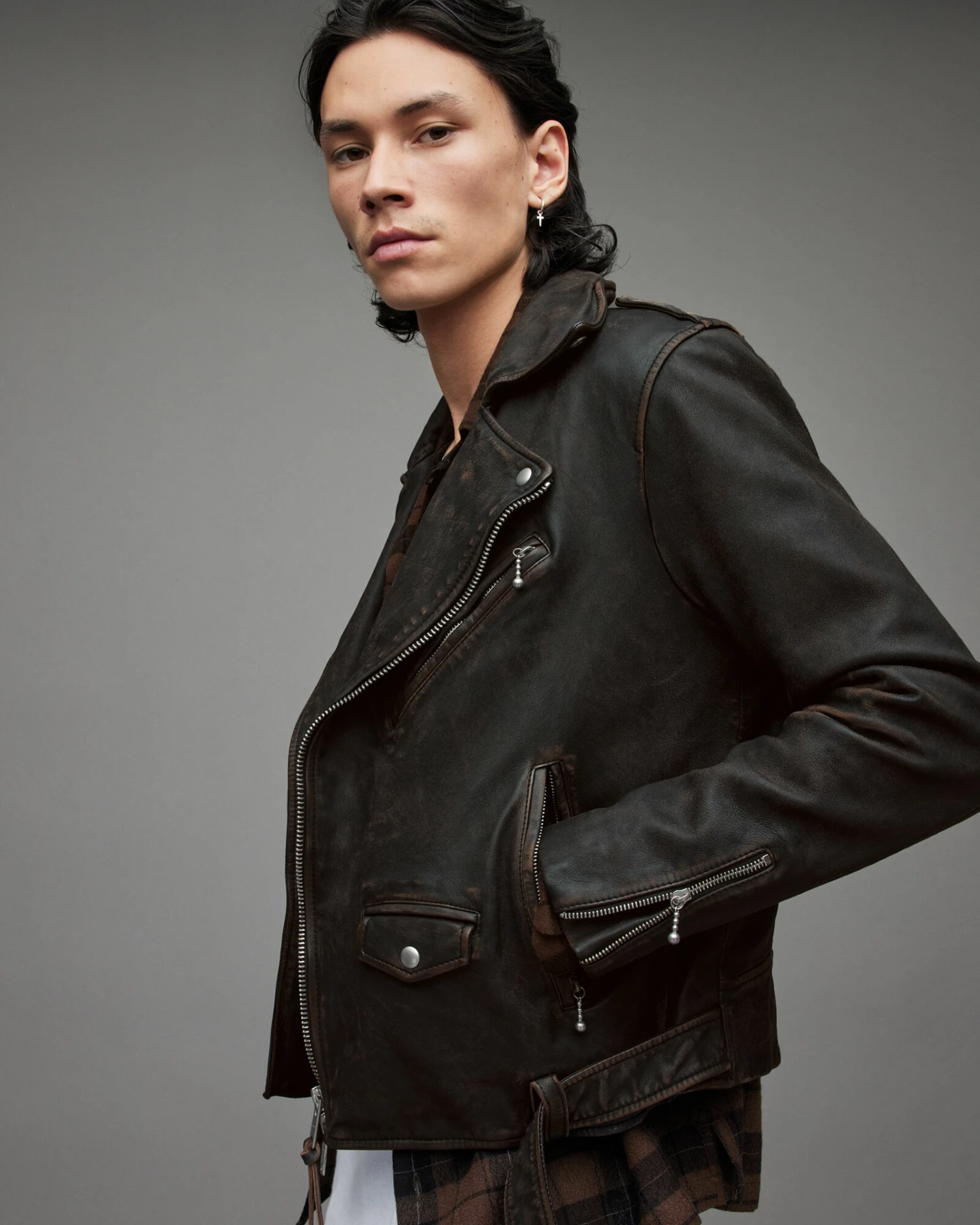 Two toned leather makes up the Torren Biker Jacket. It’s slightly cropped and has an authentic vintage look. With classic pocket detailing and metal hardware to finish.