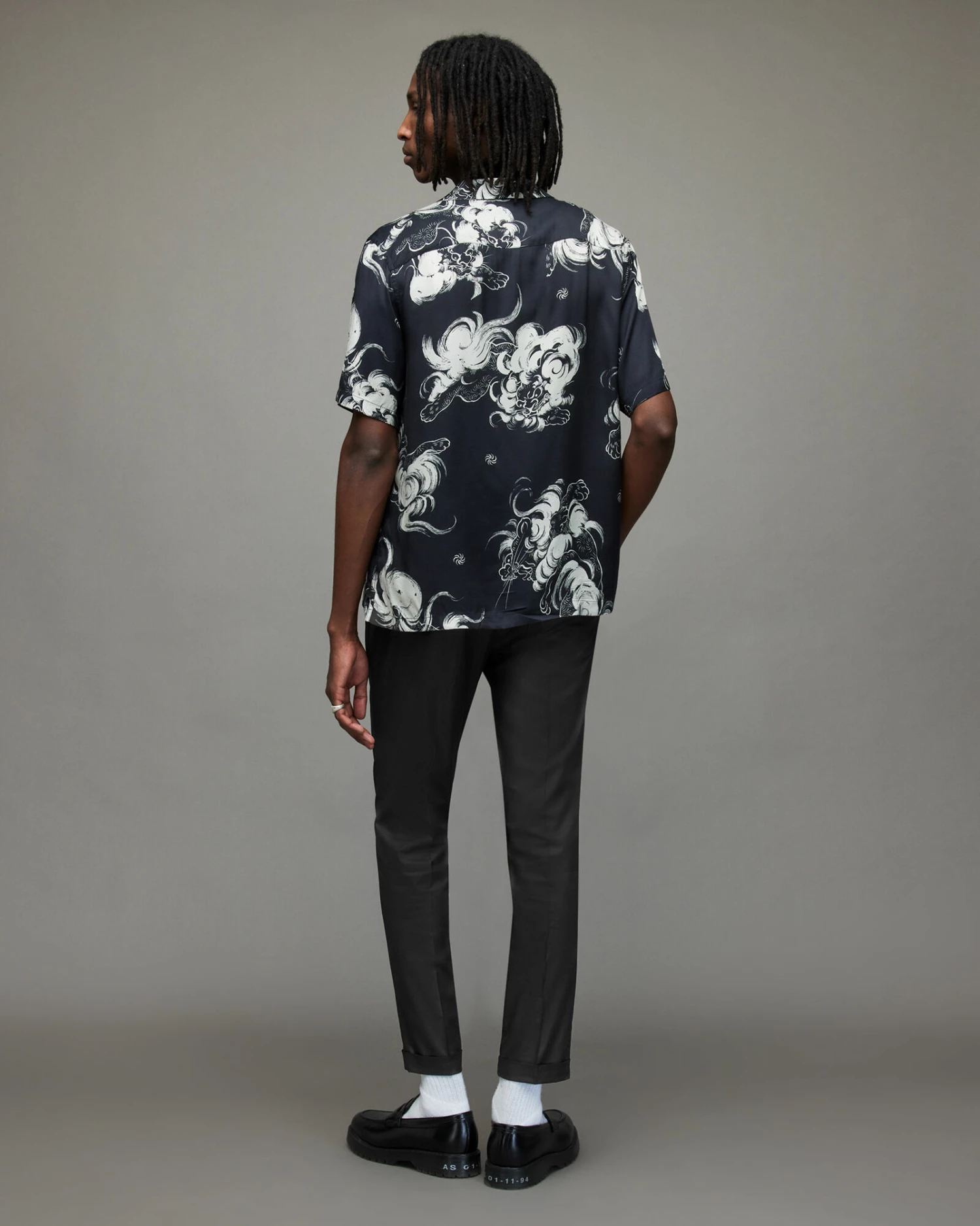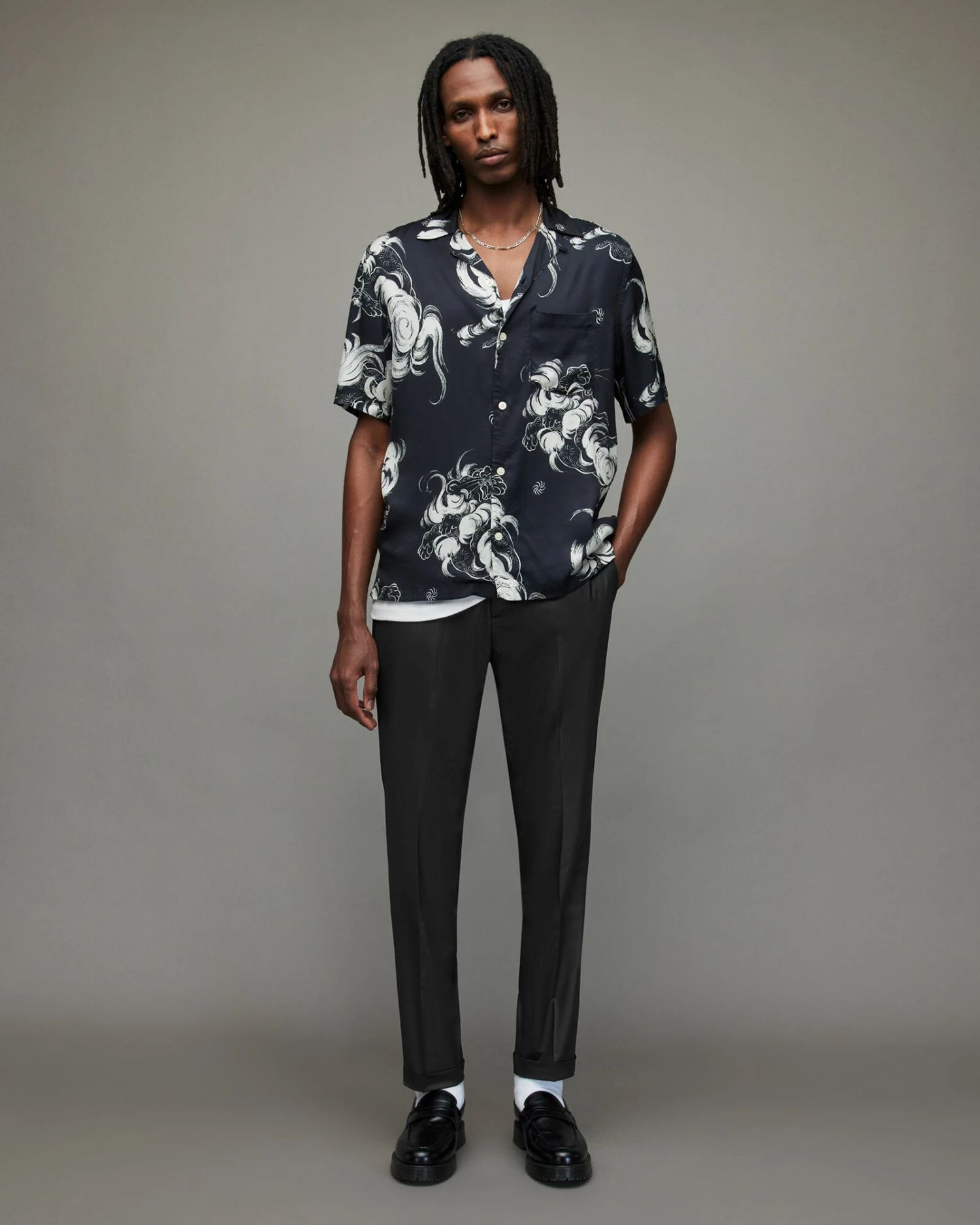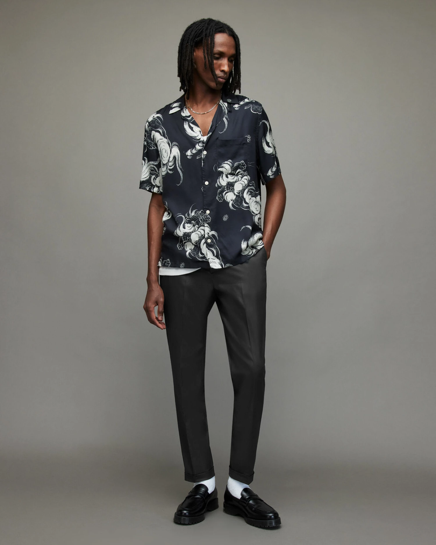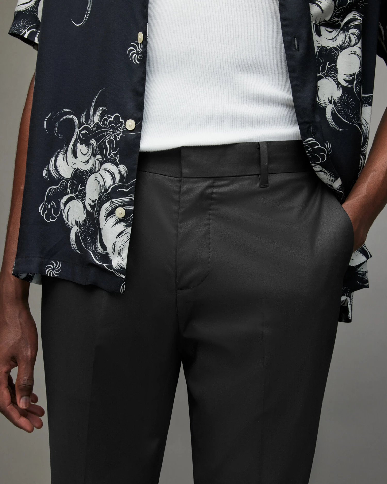 The Trade Trousers. You’ll want to dress them up. The fabric has a slight sheen to it. They’re shaped to a slim fit with fixed turn ups.