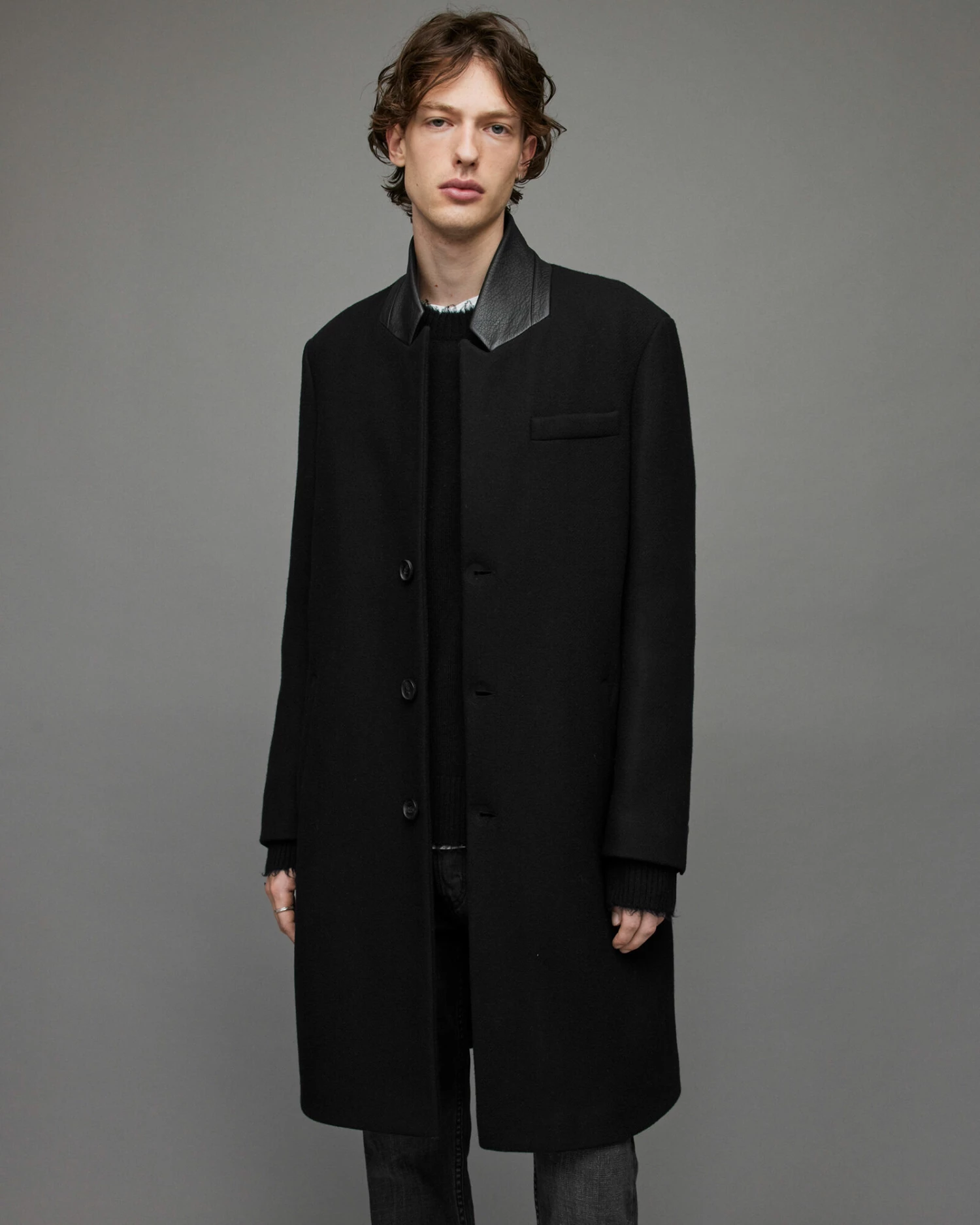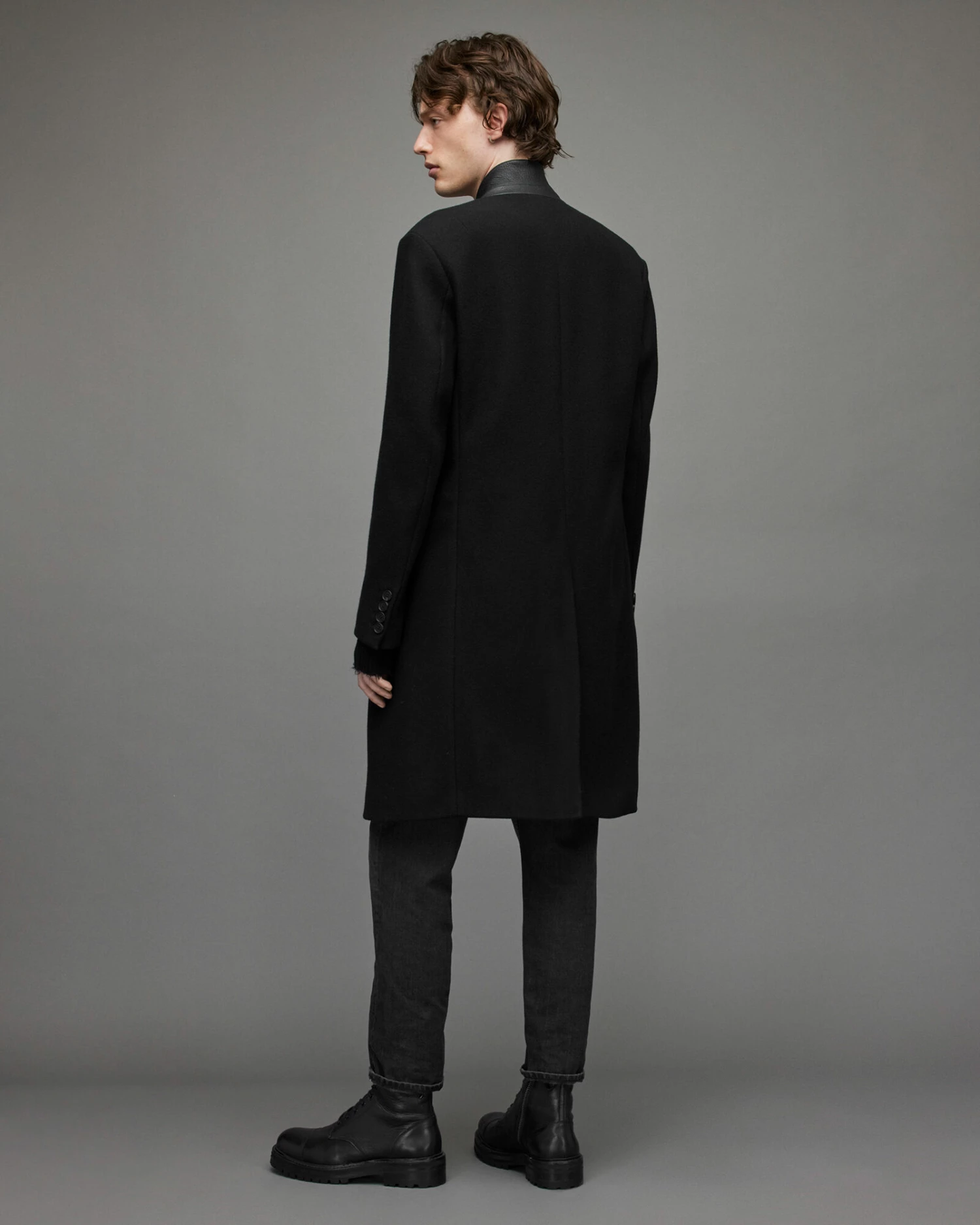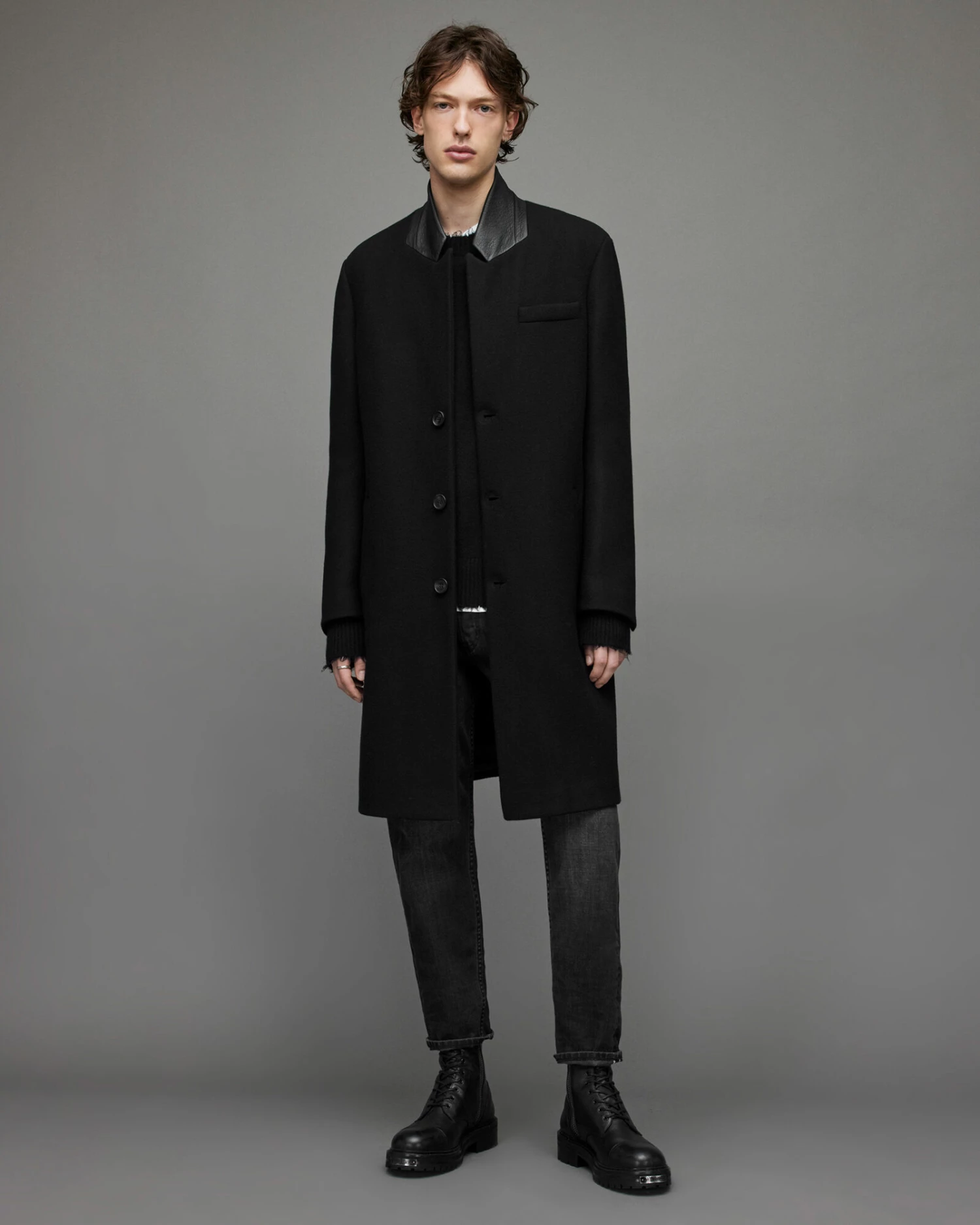 A sophisticated staple. The Truman Coat is shaped to a regular fit from a premium Italian cloth. The stand up collar is leather – that’s the AllSaints edge.
