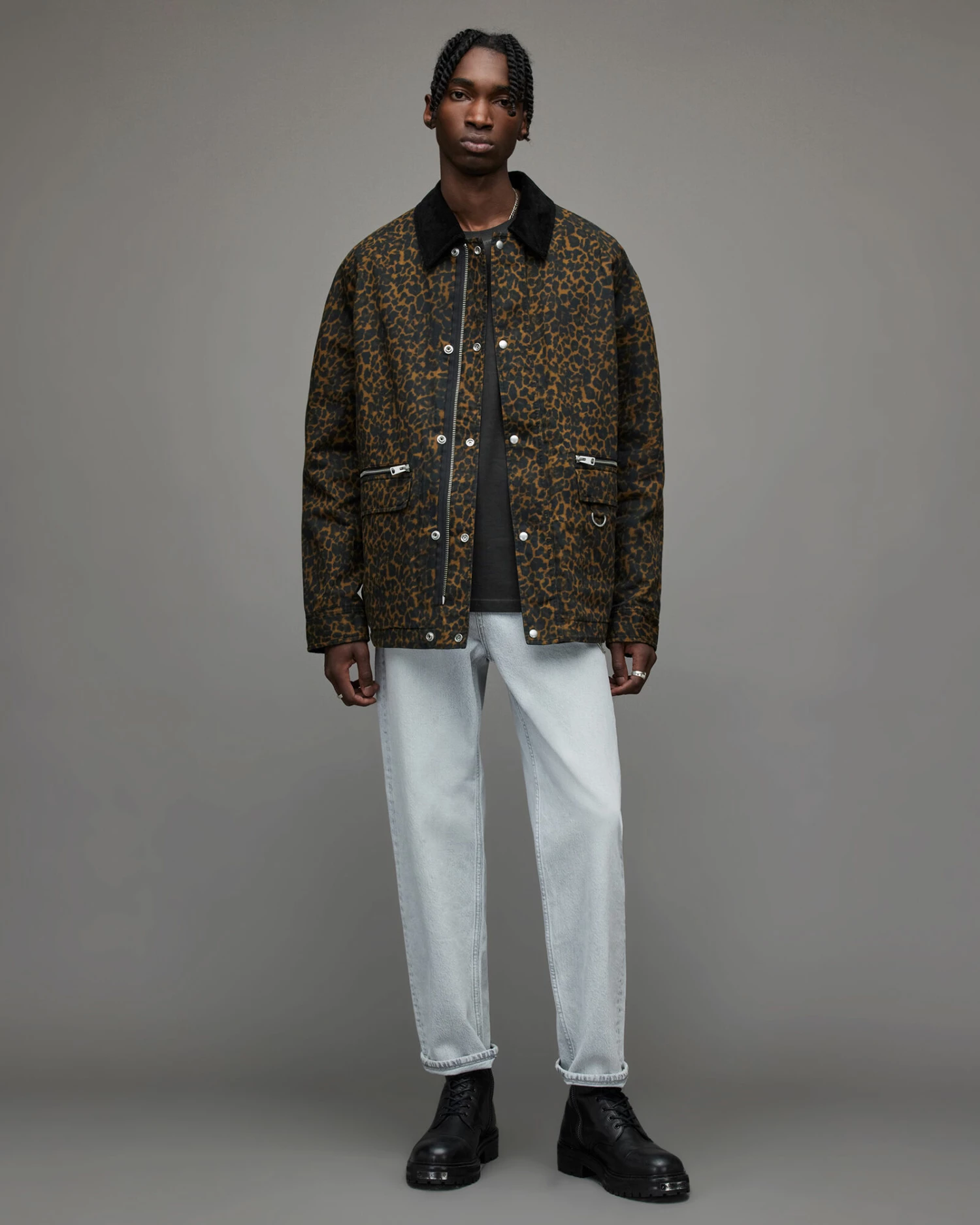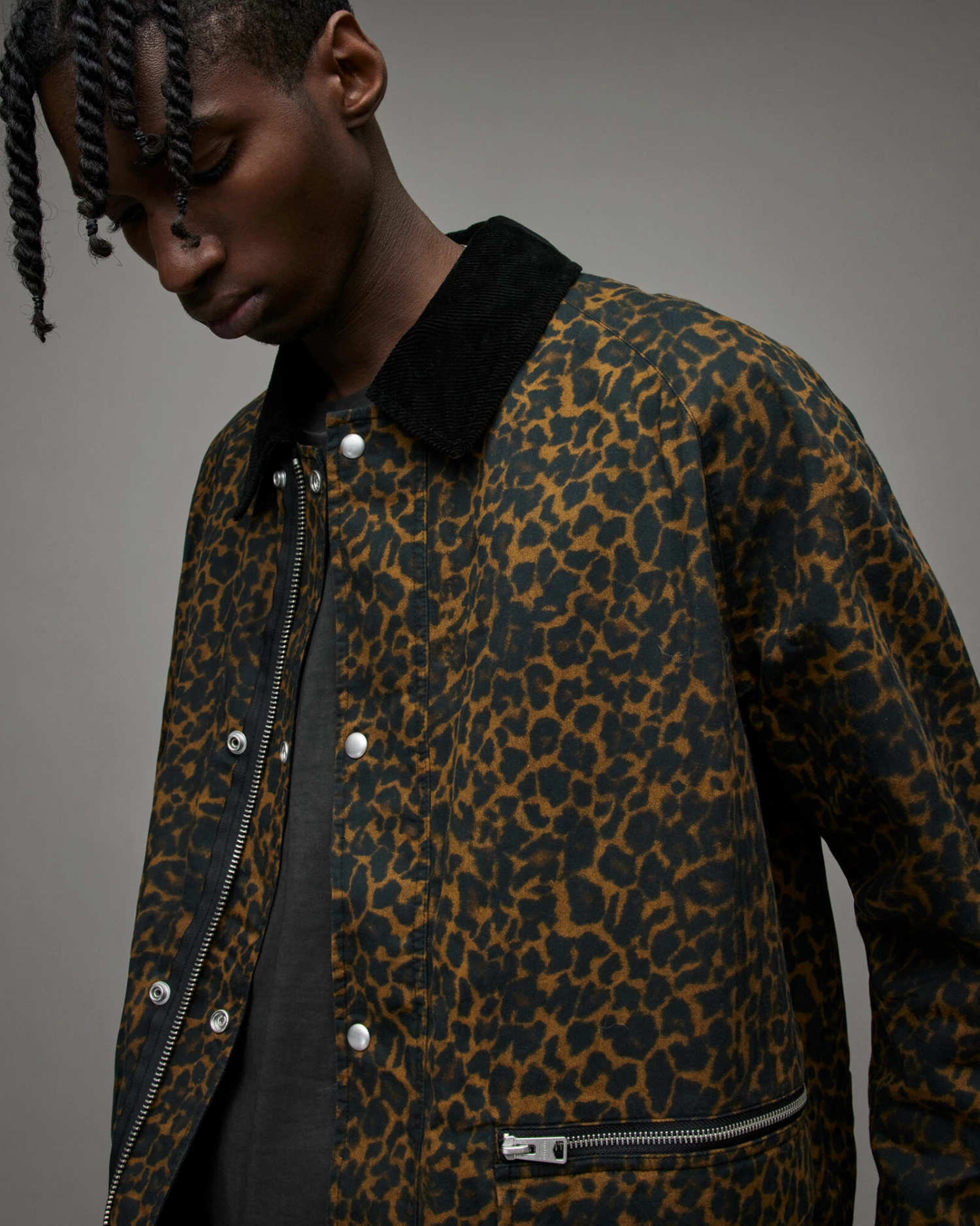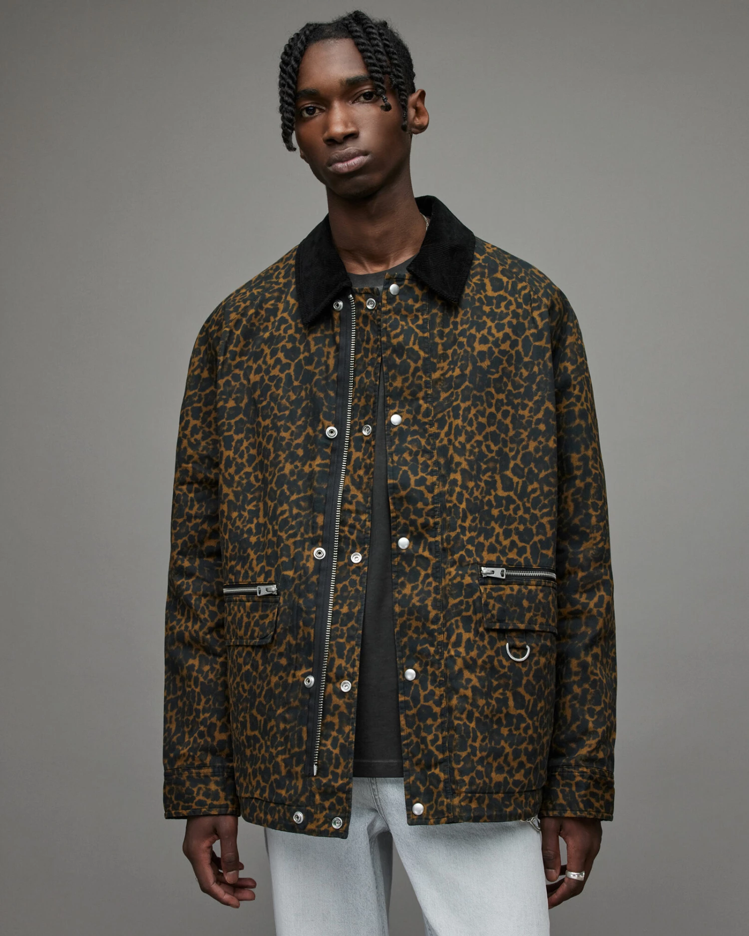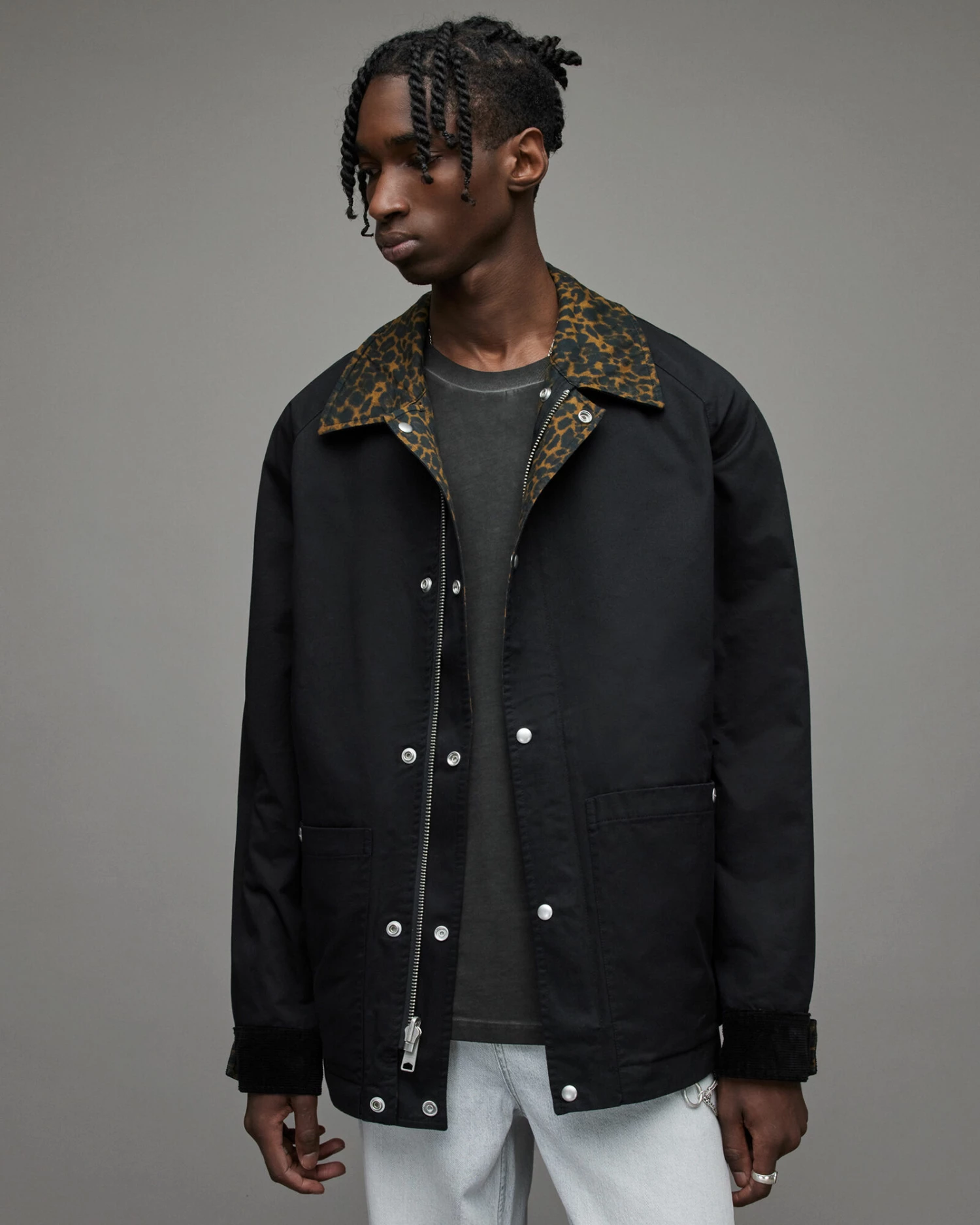 AllSaints. Spitalfields. A whole new attitude. The Vanian Jacket is reversible. Waxed herringbone leopard print on one side and a clean black finish on the other. It has corduroy trims, multiple pockets and a D-ring strap. The cloth is a collaboration with British Mill, Halley Stevensons.